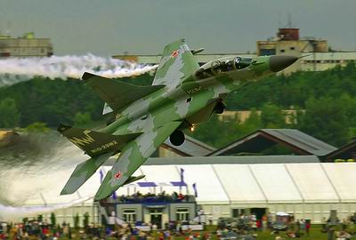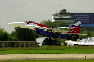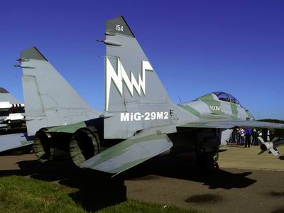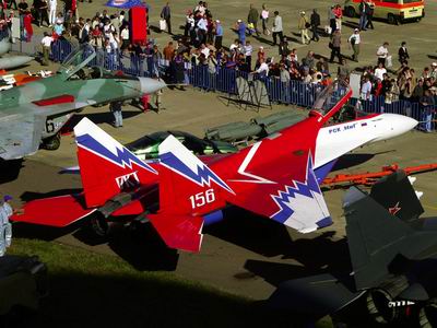 A nyilvános bemutatóhoz új festésterv is készült, már két évvel ezelőtt is a "Sztrizsi" csoport 29-eseihez hasonlóan a kék-fehér-piros nemzeti színekben pompázott az új kísérleti gép, amelynek törzsén felül még egy hatalmas vörös csillag is virít. Ha az utóbbi jelkép ideológiai hátterétől eltekintünk, akkor minden további nélkül kijelenthető, hogy a gép gyönyörüen nézett ki, illően a jelenleg egyedülálló képességeihez. A párizsi kiállításokhoz hasonlóan a statikus soron közel lehetett kerülni a gépekhez, így közeli részletfotókat is készíthettünk a MiG-29M OVT típusról, mielőtt elvontatták az indítózónába. A bemutató repülésekre Pavel Vlaszovot jelölték ki, akit méltán ünnepelt a közönség, hiszen aki látta, annak sokáig emlékezetes marad az elképesztő, hihetetlen manőverekkel tarkított nyolcperces program.