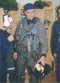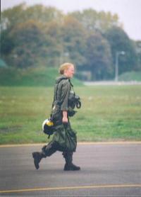 Csütörtökön amolyan igazi októberi idő fogadott, esőre álló alacsony felhőzet, de alatta elég jó látás. Nem tudtuk, az amik milyen időjárás mellett repülhetnek még, nagyon eldönthetetlenek tünt a helyzet, mindenestre helikopterre szálltunk és elindultunk. Alig 1 kilométeres látás fogadott bennünket Taszáron, de szerencsére ez még elég volt, a repülőtéren volt TACAN, így lehetett repülni. Megérkezésünk után a nyakamba esett az F-18-as pilóta, akivel előző nap harcoltam, később délután is jókat vigyorogtunk. Gyorsan megbeszéltük az F-18-as pilótákkal az előző napok légiharcait, aztán átvettek bennünket a halálfejes Jolly Rogers pilóták. Nem sokat gondolkoztak, gyorsan ránk adták a felszerelést. Pontosabban inkább lassan. Nagyon sokáig tartott a beöltözési procedúra, nagyon sok minden került ránk, mindazt, ami az orosz gépek katapultülésében található, az amik a hasukon hordják. Vészrádió, vészlámpa, vész GPS, cápariasztó, (talán még egy pici vész pipere felszerelés is a női fegyverzetkezelőknek) meg még sok minden egy túlélő mellény apró zsebeiben volt elhelyezve, amit a G-ruha és a hevederzet felett viselnek a pilóták. Úgy néztünk ki, mint aki mindjárt megszül, jó 10-15 kiló volt a hasunkra aggatva. Gyors sisakpróba, aztán indulás a géphez. Nem sokat magyaráztak, tényleg csak a legszükségesebb dolgokat tudtuk meg, például a hátsó kabinban nincsen se bot se gázkar. Ezt már a többiek is mesélték, és bizony már akkor sem örültem. Jó lett volna vezetni egy kicsit a Tomcatot, nem csak ülni ott, mint egy csomag, egy darabárú, egy pilóta sokkal jobban képet tud alkotni egy gépről, ha kicsit kezébe veheti a dolgokat. De ez harci gép, az amerikai felfogás szerint a hátul ülőnek itt semmi köze a gép vezetéséhez, neki más feladatai vannak. A terv szerint előttem Téglás Laci fog repülni, majd a bal hajtómüvet leállítják és csere. Végre elindultunk a gépekhez, nekünk a 100-as oldalszámú jutott.