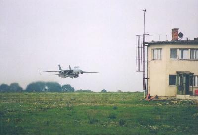 Végül eléri a beton másik végét, megfordul, picit gondolkozik, aztán meglódul. Gyorsan eljön a betonról, aztán alacsonyan gyorsít, a pálya végén pedig jó 40-50 fokos emelkedéssel eltünik a felhőben. Hosszú várakozás jön, majd feltünik a gép, besorol, kienged mindent amit kell, és leszáll. Begurul, bal hajtómü leáll, csere. Bekászálódom, gyorsan becsatolnak, sisak fel, maszk, minden kész. Ez most tényleg gyorsan ment, mehetünk. Bal hajtómü indul, aztán mi is gurulunk. Gurulás közben van időm először szétnézni a kabinban, az első, ami feltünik, a müszerfal közepén egy kapaszkodó, ezt erősen megmarkolva tényleg jól hátra lehet fordulni. Nagyon szokatlan, hogy hátra és oldalra mindent látni. Végig a szárnyakat, a függőleges vezérsíkot, sőt még a stabilizátort is, és természetesen felette mindent, az egész hátsó légteret. Előre már nem ilyen rózsás a helyzet, a katapultülés sokat takar, de az itt ülőnek erre ott van a lokátor. Hatalmas sötét kijelző uralja a müszerfalat, mellette minden másodlagosnak tünik, és az is. Nekem nem kapcsolták be a lokátort. Aztán lassan itt a beton vége, megfordulunk és hajrá.
