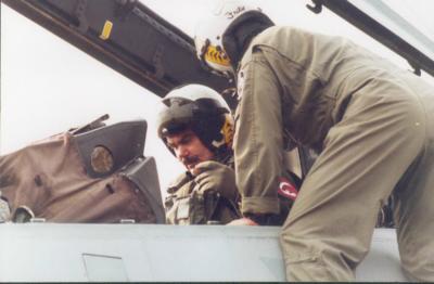 Amikor híre ment, hogy a tengerészek repülni akarnak velünk, még csak az F-18-asokra számítottunk. Tudtuk, hogy az anyahajón nincsenek kétüléses gépek, így nem gondoltunk arra, hogy mi is repülhetünk valamivel. Aztán jött a hír, hoznak két F-14-est, és azzal a magyarok is repülnek majd. A hazai szokásokat ismerve, nem gondoltam, hogy mi is „hozzáférünk” a hátsó kabinhoz. Akkor kezdtem el kicsit bizakodni, amikor már a tervtáblát is láttam, és azon rengeteg kicsi zöld vonalkát, ami Tomcat repülést jelentett, ráadásul a zöld ceruza a századparancsnokunk kezében volt. Rám csütörtökön került sor, így végig izgultam a hetet, nehogy lerobbanjon a gép. Ez be is jött, mert hétfőn az egyik gép meghibásodott. Az amik nem sokat gondolkoztak, hoztak még egy repülőt. (Úgy könnyü, ha van miből…) Az utasrepültetések így a terv szerint folytatódhattak.
