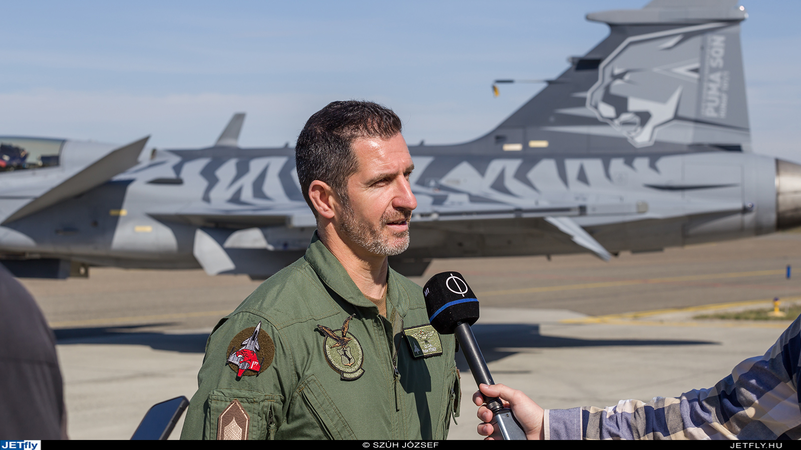 Az interjúk sorát Almási Balázs folytatta, képviselve az MH Anyagellátó Raktárbázis Kecskeméti Elemének (volt Légijármű Javítóüzem) csapatát, akik igen rövid idő alatt (kb. 3 hét), túlórákat is beiktatva alkották meg a 36-os oldalszámú Gripen egyedi festését Pozsgay Gyula illusztrátor, dizájner tervei, illetve a Gripen hajózók ötletei alapján. Almási Balázs kitért arra, hogy nem ez az első díszfestett gép a flottában, hiszen a 40-es oldalszámú példány függőleges vezérsíkján mind a mai napig látható az üvöltő pumafej, teljes festést, ami a vadászgép törzsét is érinti, viszont most először készíthettek ezen a vadászgép típuson. Interjújában hangsúlyozta, hogy nagy élmény volt elkészíteni a festést, illetve maga az egész munkafolyamat egy igazi kihívás volt: összehozni a mintát úgy a Gripenen, hogy az jól mutasson és kövesse az előzetesen papíron megrajzolt kinézetet, illeszkedve a gép geometriájához. A festést megalkotó csapat nagy tapasztalattal rendelkezik, hiszen többek között a Szolnoki Repülőmúzeum gépeit, a körforgalomakban kiállított repülőgépeket is a volt LÉJÜ szakemberi festették le, most viszont egy aktív vadászgép új mintája dicséri kezük munkáját, melyet az elkövetkező időszakban remélhetőleg hazai és nemzetközi eseményeken is láthat majd a közönség. Almási Balázs további részleteket is elárult arról, hogyan kerül fel egy ilyen minta a repülőgépre, milyen precizitást igényel a kinyomtatott sablon gépre való felragasztása, a maszkolószalagok (közel 40 tekercs) alkalmazása, továbbá a minta tükrözése, hogy a Gripen mindkét oldalán a lehetőségek szerint szimmetrikus legyen.