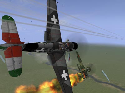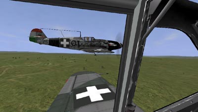 Ahogy közeledtünk az ominózus területhez, kezdtek felrémleni az események... Szóval Wickkel 6000 méter fölött voltunk bõven, mikor az elsõ ellenséges pontocskát megpillantottuk. Két másik gép is jött vele, és úgy látszik nem vettek észre minket, mert pont alattunk szállnak tova olyan ötezer méteren. -Pumák, fegyvereket bekapcsolni! -adom a vezényszót. A vadászösztönömet most nem kellett visszafognom: ellenséges gép biztosan nincs egy magasságban velem. Sõt körülöttem messzereikben Wick (a kisérõm) és rajtársaim, Yosser, Rudi, Artesz és NateDog szelték az eget önbizalmat gerjesztve. Szép kis csapat! Egy pillanat sem telik el, mióta elmentek alattunk, és máris gépemet leborítva száguldok az egyik gyanútlanul szállingózó randa, ruszki gépmadár felé. Rövidesen egyértelmûen kiderül, hogy LaGG a gép típusa. Ilyenkor szívverésem felgyorsul, és szûk kabinomban összekuporodom, mintha ezen múlna, hogy észrevesz-e a kiszemelt áldozatom. A feszültség óriási! Úgy érzem a gégemikrofonom megduzzadt, annyira szorítja a torkomat! Szépen lassan -illetve, dehogy lassan: villám-gyorsasággal!- elõtünnek az ellenséges gép részletei. Elõször a forma, aztán a vörös csillagok, a gép száma, sõt valami primitíven felfestett orosz firka-mirka. -Adok én neked gépfestést bolsi-koma!- gondoltam magamban, és ezzel meg is eresztettem gépem három tûzhányóját: a két kicsit és a nagyot, mely kétcentis, kék tûzgolyókat szórt a messzerem orrán keresztül. Néhány villanás után sok-sok füstpamacs borítja a ruszki masina orrát, majd szárnytövét! Elzúgok mellette és szinte látom, hogy olaj-, vagy talán vérfoltok borítják a kabint. Azonban úgy tûnik pilótája még uralja a gépet, mert késõn ugyan, de leborít és beleolvad a földháttérbe.