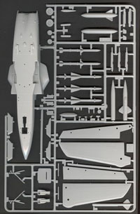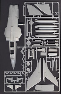 A zacskóból kivéve az öntőkereteket csak annyit mondunk, "huhh ez nem is rossz". 111 alkatrész, finom gravírozás, szinte sorjamentes kidolgozás, 10 átlátszó alkatrész. A törzs nem vízszintesen van kettévágva, hanem egy panel mentén függőlegesen, ez jó, könnyebb eltüntetni majd az illesztés nyomát. Kapunk két Sidewindert, két póttartályt, két Kormorant, két Cerberus zavaró konténert. NINCS Boz 107 infra/radar zavaró szóró. Ez azért is érdekes, mert az olaszok két Bozzal repülnek többnyire, a németek pedig vegyesen egy Bozzal egy Cerberussal, bár láttam képet olyan Marine gépről amin két Cerberus volt, de ez a ritkább eset.