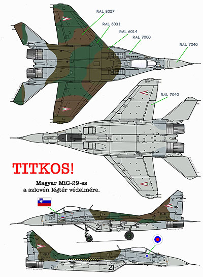 Sikerült szerkesztőségünknek megszereznie annak a MiG-29-esnek a festési rajzát, amelyet a szlovén légtér védelmére kiírt pályázatra nyújtott be a Légierő Kreatív Tervező Osztálya. Az eredeti rajzot szerzői jogi okokból nem közölhetjük, ezért azt le kellett rajzolnunk. A részletek sajnos mind a mai napig titkosak, annyit azonban sikerült kiderítenünk, hogy a már átfestett gépet a magyarok agresszor célra kívánják használni, természetesen a szlovén nemzeti jelzések nélkül. (Akinek sikerül lencsevégre kapnia az új festésű Fulcrumot, az a JETfly szerkesztőségének különdíját kapja.)