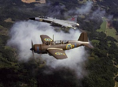 A Saab legrégebbi és legújabb harci gépe kötelékben