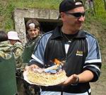 Aki csak ismer minket az tudja, hogy a Jetflytól nem áll messze a tréfálkozás sem. Tehát Topit megleptük egy tortával, mely közepére egy MiG-29-es marcipán vadászgép „svancát” raktuk úgy, mint ahogy a szerda lezuhant gép földet ért. A vadászgép hajtóműveinek helyére két csillagszórós gyertyát tettünk, de persze csak a baloldalit gyújtottuk meg.
