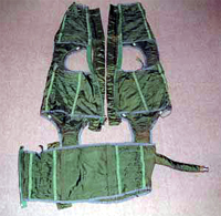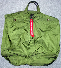 Nyugati típusú, zöld színü hajózó táska; sisak és térdblokkok számára.