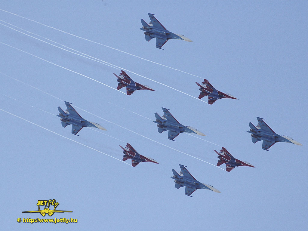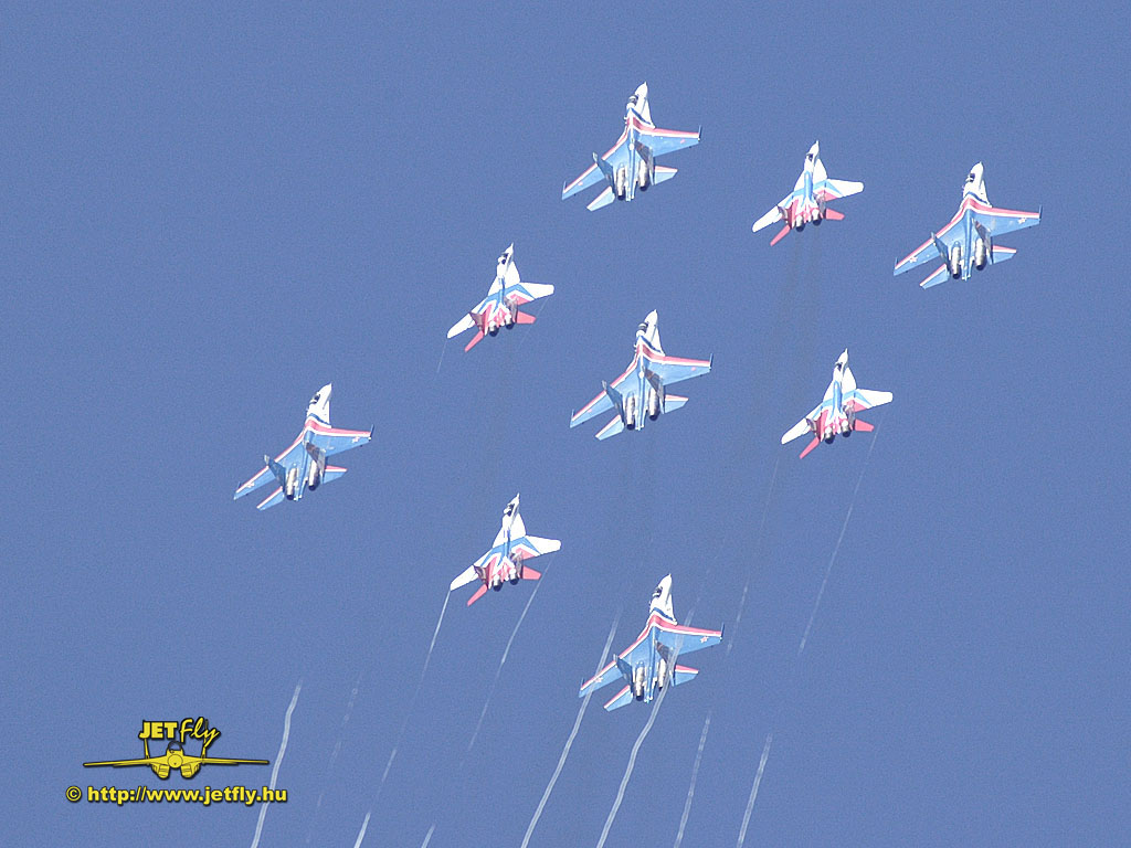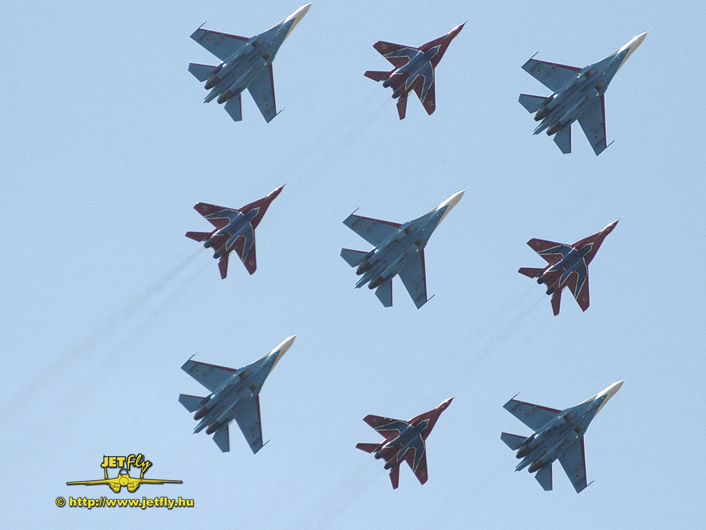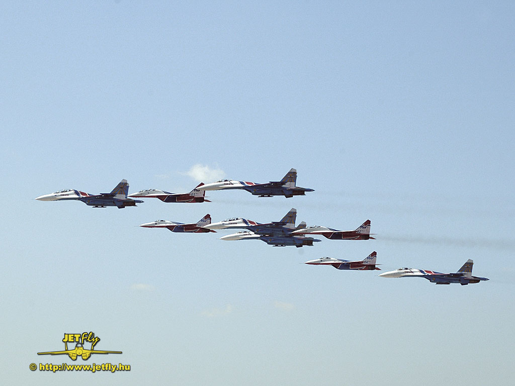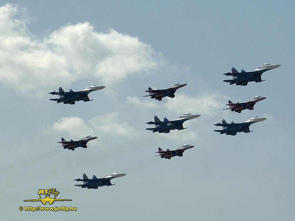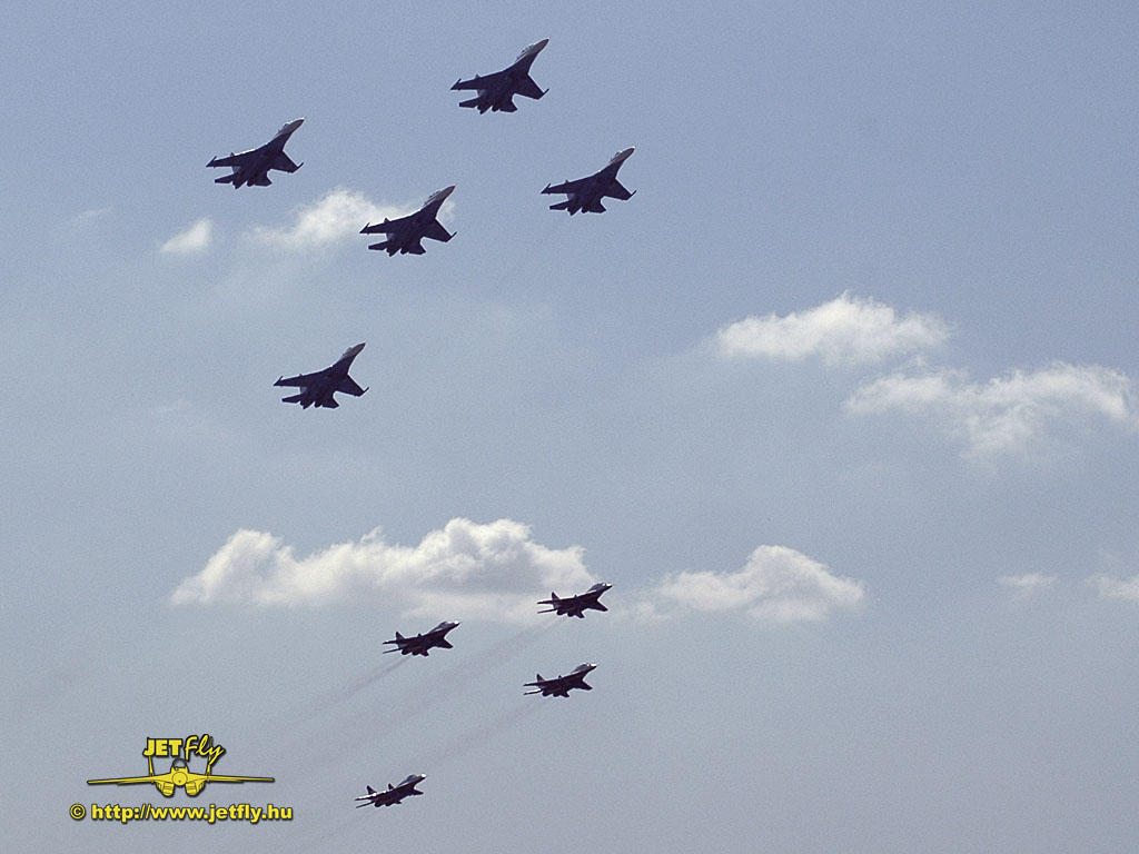 Ritka pillanat, mikor négy MiG-29-es és öt Szu-27-es vadászgép dübörög a levegőben a közönség előtt. Összesen tizennyolc hajtómű. Ha a hangot nem is, de a képeket most ide varázsoljuk a MAKS 2005 repülőnapról, Moszkvából.