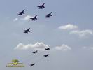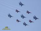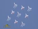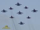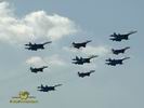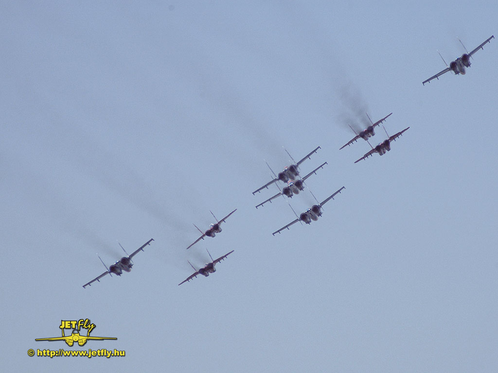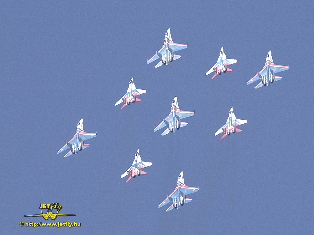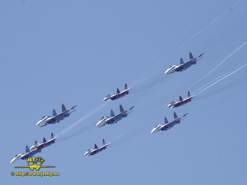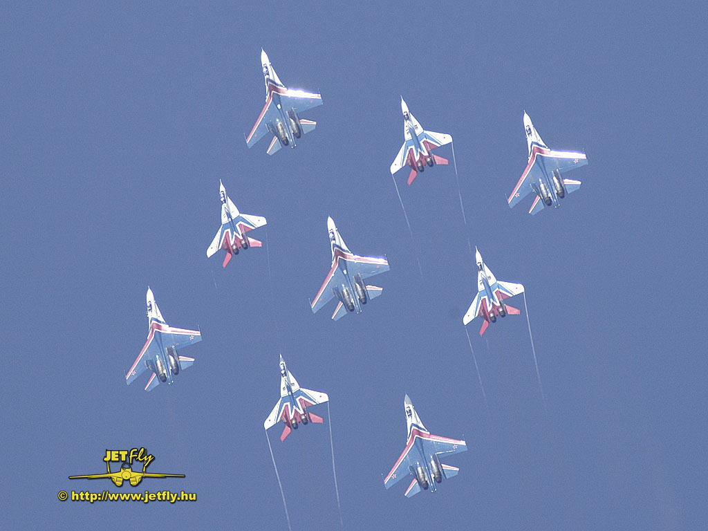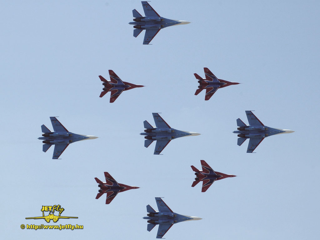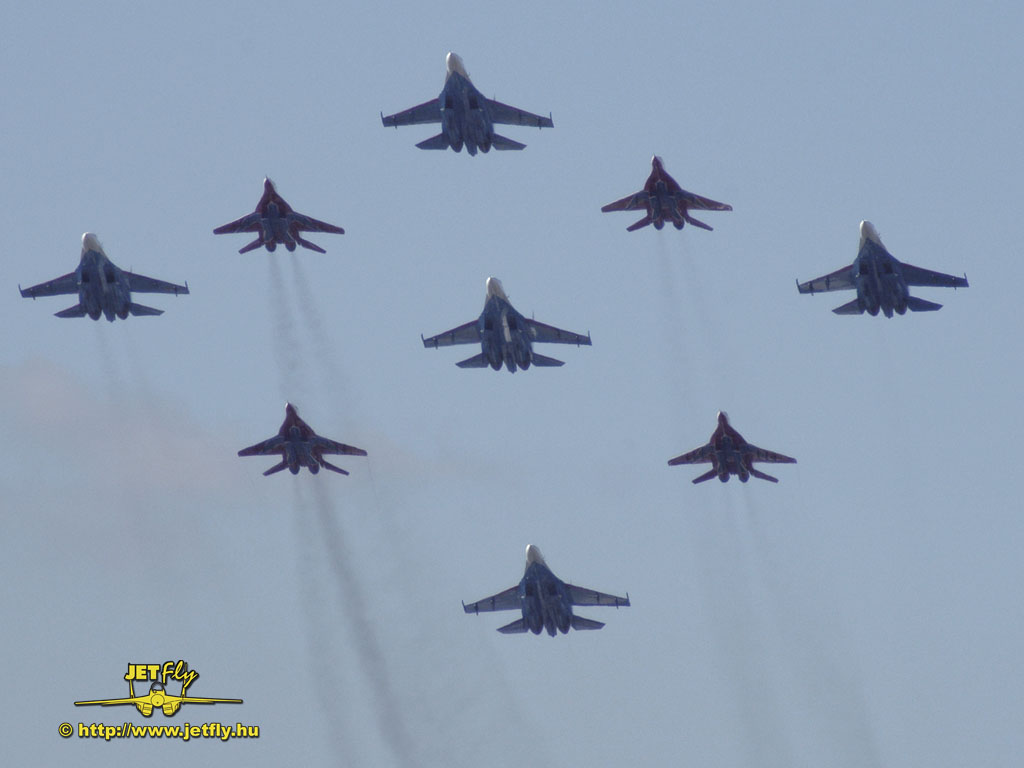 Ritka pillanat, mikor négy MiG-29-es és öt Szu-27-es vadászgép dübörög a levegőben a közönség előtt. Összesen tizennyolc hajtómű. Ha a hangot nem is, de a képeket most ide varázsoljuk a MAKS 2005 repülőnapról, Moszkvából.