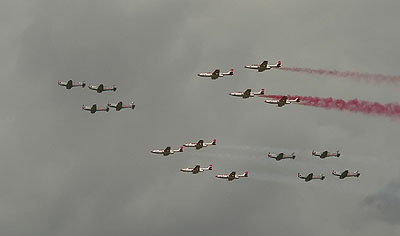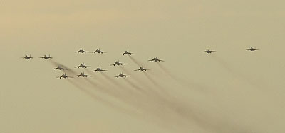 A Lengyelek TS-11 Iskra köteléke magához képest színvonalas programot repült, bár látszott, hogy kevesebbet gyakorolnak nyugati társaiknál, valamint a gépeik teljesítménye is erősen kívánni valót hagy maga után. Az Orlik kötelék nagyon szépen repült, bár kicsit hosszú 25 perc körüli programot mutattak be. Az amerikai F-16C után érkezett a Lengyel Légierő jelenlegi csúcsvadásza, a MiG-29. Bődületes kezdéssel kb. 10 méteren tolta végig a két Tumansky hajtómü a gépet a pálya tengelyében, majd annak végén közel 90 fokos emelkedésbe kezdett, hasonlóan a Blue Angels F-18 gépéhez. Ezután néhány nagy G terheléssel járó forduló után váratlanul abbahagyta a produkciót és távozott a légtérből. Gondolom, hogy valami meghibásodás, vagy egyéb dolog történt, mivel körülbelül 5-6 perc csak el a bemutatóból. A franciák mürepülő köteléke szokott színvonalú repülését mutatta be. A Mirage 2000 szólót Yanik Vallet kapitány repülte. A program erőssége a hollandéval vetekedett. A Mi-24W gyenge bemutatót repült, az alkonyati fényben. A Red Arrows a kötelékek közül magasan kiemelkedett precizitásban és a változatos programmal.