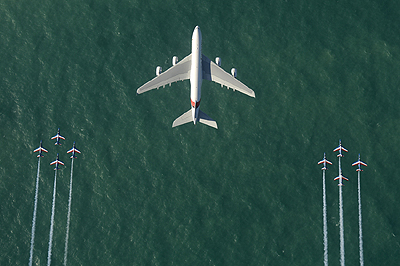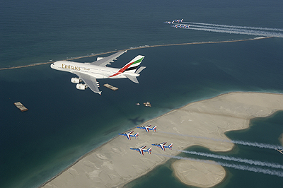 A Dubai Airshow egyik rendkívül látványos érdekessége volt, hogy az A380-as Super Jumbo és a Patrouille de France bemutatókötelék közös repülést hajtott végre. Az eseményről készített felvételek közül íme néhány:
