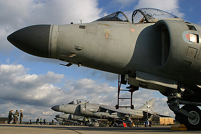 A Fleet Air Arm, a flotta légiereje a Sea Harriereket március végén állítja le. A Royal Navy repülőszázadainak Harrier GR.7/9-es csapásmérőkre való átállása az újjászervezett 800. század április 1-én történő átképzésével kezdődik meg. A 801. az év végén követi majd. A századok pilótái már típusvizsgát tettek a GR.7-es vezetéséből, de a legnehezebb még hátra van, a légi harcról át kell állniuk a földi célok támadására. A GR.7-es stabilizáló rendszere miatt könnyebben vezethető fel- és leszálláskor, de a flotta pilótái - a fedélzeti radar hiánya miatt - bizonyos fokig védtelennek érzik magukat. Bár légi közelharc esetére vannak fegyvereik, de ahhoz, hogy elkerüljék ezt a nem kívánatos, legrosszabb esetet, mindenképp egy AWACS-gép segítségére szorulnak.