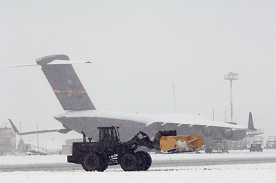 Az elmúlt hetekben Európában tapasztalható hideg időjárás és havazás megnehezítette a repülőterek életét is. Az USAF nehéz szállító repülőgépeinek állandóan útra készen kell állniuk, hiszen a Közel-Keleten állomásozó egységek ellátásában döntő szerepet kapnak.