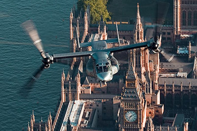 Az amerikai tengerészgyalogság két V-22-ese, melyekről már hetek óta beszélt a média, Európában először Fairfordban szerepelt nagy nyilvánosság előtt, ezen a hétvégén pedig Farnboroughban, a közönségnapokon. A géppár a Temze felett repkedett fel és alá, azon folyosón, melyet hivatalosan a helikopterek számára jelöltek ki. Az útvonalról csak azért tértek le, hogy tiszteletkört írjanak le a brit védelmi minisztérium épülete felett.
