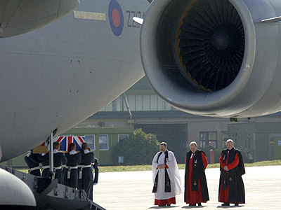 Az elhunyt katonák földi maradványait a Royal Air Force C-17 Globemaster szállítógépe hozta haza Afganisztánból. A gyász szertartáson az egyházi személyek mellett megjelent a hadsereg és a légierő szinte teljes vezérkara is.