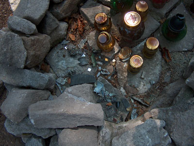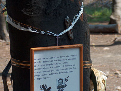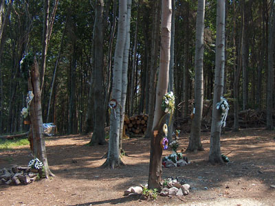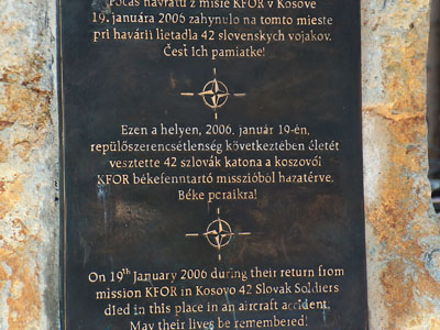 Végül felérsz egy hegytetőre. Balra furcsák a fák lombkoronája, majd derékba tőrt facsonkok, és utánuk egy irtás. Ahogy párhuzamosan mész vele az irtás után fákra kötözött kereszteket, virágokat látsz. És ahogy balra rákanyarodik az út, már oda is értél. Most látod csak, hogy mennyi virág van a fákon, és mindennek a közepén egy sárga kő obeliszk. Egyenesen oda mész az obeliszkhez. Egy tábla van rajta, szlovák, angol és magyar nyelven.„Ezen a helyen 2006 január 19.-én repülőszerencsétlenség következtében életét vesztette 42 szlovák katona a koszovói KFOR békemisszióból hazatérve. Béke poraikra.”