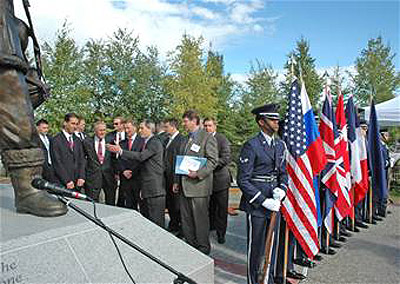 „Úgy adózhatunk leginkább azok emlékének, akik előtt most tisztelgünk, hogy a napjainkat fenyegető veszélyeket ugyanazzal a higgadt fejjel, egységgel és bátorsággal hárítjuk el, mint azok a férfiak és nők, akik itt szolgáltak azokban a nehéz időkben” – jelentette ki Donald Rumsfeld védelmi miniszter.Több mint egy tucat orosz küldött is jelen volt az ünnepségen, élükön a kormány helyettesével és Szergej Ivanovval. Az orosz védelmi miniszter azt nyilatkozta: „Amerikai és orosz pilóták, akik a fél Földet átrepülték egy nagyon nehéz útvonalon, miközben hihetetlen nehézségeket győztek le csak azért, hogy a katonai repülőgépeket célba juttassák. A háború együttmüködést hozott, és az ebből fakadó tapasztalatok példaértéküek az új generációk számára is. Ezt nem szabad elfelejteni, hanem meg kell őriznünk.” Végül Ivanov hozzátette még: „Szent feladatunk megőrizni a múlt emlékeit, hogy örökké megmaradjanak. Dicsőség a II. világháború győzteseinek!”