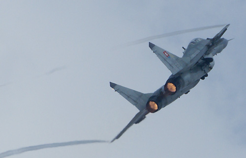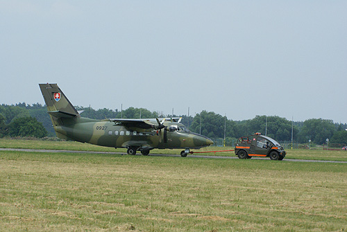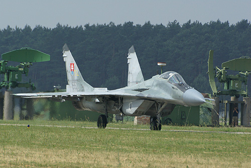 Időközben az együléses (társa, egy kétüléses UB a statikus soron állt) MiG-29-es is kigurult a felszállópályára. A forszázzsal, rövid nekirugaszkodás után levegőbe emelkedő Fulcrum rendkívül dinamikusan kezdett. Szük vízszintes fordulók és nagy sebességü áthúzások követték egymást, az alacsony felhőalap miatt a pilóta ugyanis kerülte a függőleges manővereket. A rövid, ám meglehetősen intenzív bemutató méltó volt az elmúlt években látott szlovák MiG-29-es produkciókhoz. A délelőtti dinamikus blokkot egy piros füstölőkkel látványos programot repülő Mi-24 Hind és az ejtőernyősöket ugrató L-410-es zárta. A viszonylag kisszámú nézősereg ezt követően a cseh és szlovák repülőnapok elmaradhatatlan kellékének számító lacikonyhás sátrak felé vette az irányt.Délután ugyanez a program ismétlődött meg, a két sugárhajtású típus azonban némileg eltérő bemutatót repült a délelőttihez képest. A befejezést követően a fő látványosságot a statikus soron álló gépek elvontatása jelentette. Az erre a célra rendszeresített kis vontatók az indítási zónába húzták a más bázisról érkezett repülőgépeket és helikoptereket, míg a programban szereplő helyi szállítógépeket visszahúzták állóhelyeikre.