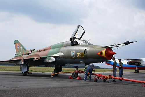 A statikus soron kiállított Szu-22M4 Fitter vadászbombázó körül tevékenykedő szerelők olyan hatást keltettek, mintha a gép még mindig üzemképes állapotban, rendszerben lenne
