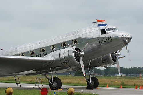 Változékony időjárás és kihaltnak tünő környék fogadott az 1300 km-es út megtétele után szombat hajnalban a Brabant tartomány északi részén fekvő Volkel légibázis egyik bejáratánál. A repülőteret még a megszálló német csapatok kezdték el kiépíteni a II. világháború idején, majd a partraszállást követően brit repülőerők használták. A hollandok az 1950-es évektől vehették ismét birtokukba az egyre fejlődő támaszpontot, mely napjainkban három, F-16-os harci gépekkel felszerelt repülőszázadnak (a 311., a 312. és a 313. század) és számos kiszolgáló müszaki alakulatnak ad otthont. A Holland Királyi Légierő egyik legfontosabb bázisának számító repülőtéren több mint ezerötszáz ember dolgozik, kiemelt stratégiai értékét jellemzi, hogy helye a Google Earth müholdképein is csak kitakarva látható… Az Open Dagen 2007 hivatalos honlapján már hónapok óta figyelemmel követtem a résztvevők örvendetesen bővülő listáját, így nagy várakozásokkal érkeztem a Holland Légierő nemzetközi mércével is komolynak ígérkező nyílt napjára. Némi, a buszban eltöltött pihenő után reggel nyolc órakor, az elsők között léphettem a hatalmas bázis területére, melynek ezúttal az egyik felszállópálya és a repülőteret övező kerítés közötti szakaszát nyitották meg az érdeklődők számára. Az első megpillantott repülőgép a KLM Royal Dutch Air Lines gyönyörü állapotú DC-2-es utasszállítója volt. A natúr fémszínü repülőgép klasszikusan elegáns vonalaival kiváló fotótémát szolgáltatott.