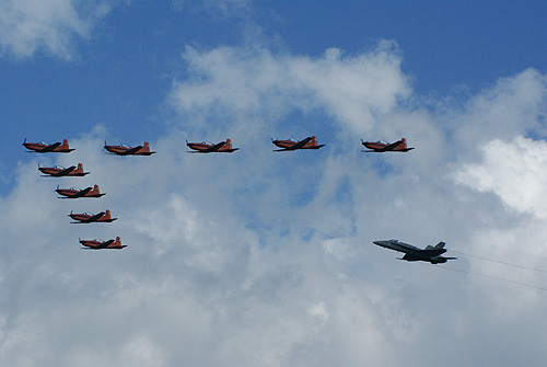 A profi bemutatókötelékek is nagy szerepet kaptak az Open Dagen 2007 rendezvényen: az augusztusban hazánkba is ellátogató Breitling Jet Team sötétkék L-39 Albatrosai mellett a svájci PC-7-es csapat és a Jordán Sólymok is nagyszerü produkcióval rukkoltak elő. Külön érdekesség volt, hogy a Svájci Légierő egyik, szólóbemutatót repülő F-18 harci gépe együtt kötelékezett a szintén helvét Pilatus PC-7-esekkel. A nagy állásszöggel repülő, bivalyerős Hornet gyönyörüen tartotta a légcsavaros kis gépekkel a formációt, majd hatalmas hangorkán kíséretében kiemelkedett az alakzatból, és megkezdte a rendkívül látványosra sikeredett, szük fordulózását.