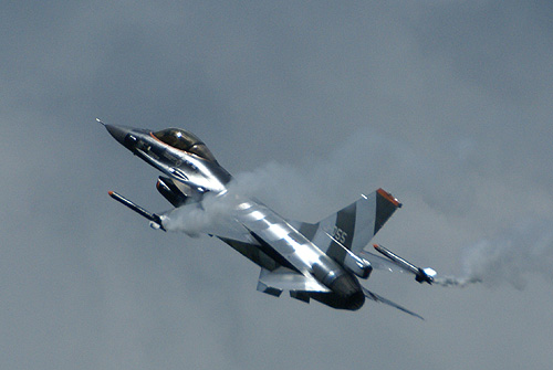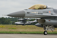 A Spanyol Légierő ugyancsak F-18-assal repülő pilótája svájci kollégájával ellentétben a nagy túlterhelésü manőverek helyett inkább a nagy állásszögü áthúzásokkal kápráztatta el az időközben igen jelentősen felduzzadt, becsléseim szerint százezres tömeget. A délelőtt egyik csúcspontja kétségkívül az volt, amikor a Volkel bázison állomásozó repülőszázadok állományából kijelölt 15 darab F-16-os harc gép pár perc leforgása alatt a levegőbe emelkedett, majd kétszer is tömeges imitált csapásmérést hajtottak végre a repülőtér ellen. A földön elhelyezett pirotechnikai eszközök megfelelő idejü felrobbantásával élethü háborús hangulatot varázsoltak a holland katonák a támaszpontra, míg a légtér különböző pontjairól nagy sebességgel feltünő F-16-osok demonstrálták csapásmérő képességeiket. Az adófizetők számára látványosan bizonyították, hogy egy esetleges háborús konfliktusban nagy erejü megelőző támadást tudnak végrehajtani az ellenséges repülőterek megbénítása érdekében.