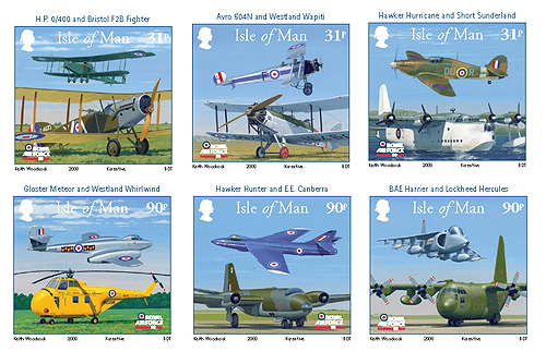 A Man-sziget posta hivatala 2008. január 15-én jelentette meg azt az ünnepi bélyeg-sorozatot, amelyet az Angol Királyi Légierő (RAF) megalakulásának 90. évfordulójára készítettek el. A hat darabból álló sor 31, illetve 90 pennys bélyegekből áll, melyek a légierő gépállományának múltját és jelenét ábrázolják. Az előbbieken a repülés korai időszakát képviselő H.P. 0/400-as és Bristol F2B vadászgép, továbbá Avro 504N és Westland Wapiti, valamint Hawker Hurricane és Short Sunderland típusok láthatók. A 90 pennys példányokon, pedig már a II. világháborút követő évek következnek a Gloster Meteorral és Westland Whirlwind helikopterrel, illetőleg a Hawker Hunterrel és az English Electric Canberrárval, végül a BAE. Harrierrel és a Lockheed Herculessel fejeződik be a nem mindennapi széria. Az illusztrációkat Keith Woodcock készítette, míg a tervezés a Kcreative cégnél történt. A légi eszközök típusjelzését feltüntető kísérő szöveget Graham Pitchfork repülő parancsnok és szakértő írta. A 36x36 mm-es méretü bélyegeket ofszet kőnyomatos nyomdai eljárással készítették.