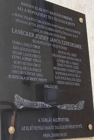 Szombaton került sor Pápán, e tetszhalotti állapotából idén feltámadó repülővárosban az Első Repülő Baráti Találkozóra A rég nem látott ismerősök boldog viszontlátásának szándéka mellett a találkozó szervezői emléket állítottak a helyi, 2000-2001-ben felszámolt 47. repülőezredben, szolgálatteljesítés közben életüket vesztett 16 hajózónak. A táblára felkerült az alakulat utolsó parancsnokának, Lanecker József ezredesnek is a neve, aki már 2003-ban, más beosztásban vesztette életét egy Jak-52-es katasztrófában.