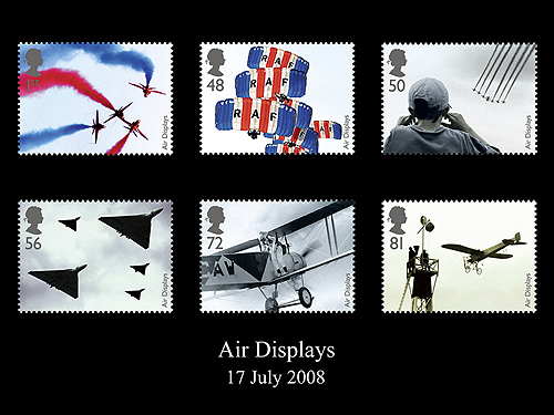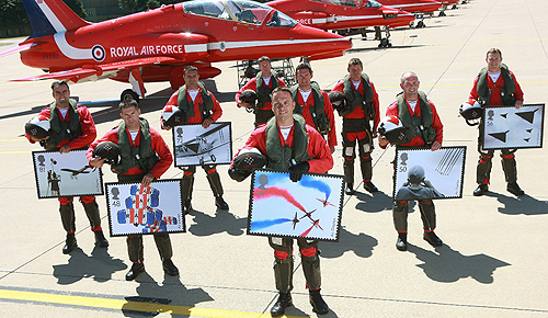 Nagy-Britanniában már bélyegeken is megemlékeznek az elmúlt évtizedek légi bemutatóiról, valamint a nemzetet meghatározó repülőgépekről és legendás pilótáiról, illetve bátor ejtőernyősökről. A Royal Air Force méltán népszerü bemutató köteléke, a Red Arrows, 2008. július 17-én, a Lincolnshire-i bázison bocsátotta hivatalosan is útjára a Royal Mail (Brit Királyi Posta) legújabb ünnepi repülő-bélyegkollekcióját. A híres légi-akrobata csapatot természetesen az első osztályú, azaz a legdrágább bélyegen örökítették meg. Őket a legjellegzetesebb módon, a repülések közben elmaradhatatlan vörös és kék füstfelhőkkel ábrázolják. A fénykép eredetijét 2006-ban, a Dartmouth Regatta Airshow-n Leigh Harris készítette róluk. A repülés elkötelezett rajongói tudják, hogy a Red Arrows, a RAF (Brit Királyi Légierő) légi bemutató csapata. Az 1965-ben alakult formáció 53 országban összesen több mint 4000 bemutatót tartott napjainkig. Sikerük azóta is töretlen. Az 50 penny-s bélyegen szintén a Red Arrows kötelék látható repülés közben. Ellis Nadler 2006-ban, Farnborough-ban készítette a fotót, egy ifjú rajongó szemszögéből.
