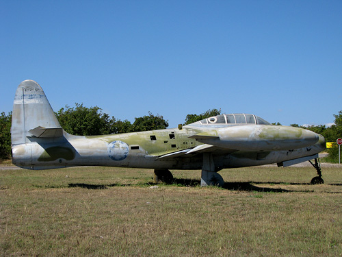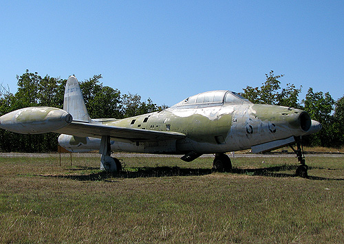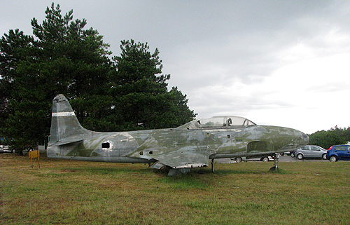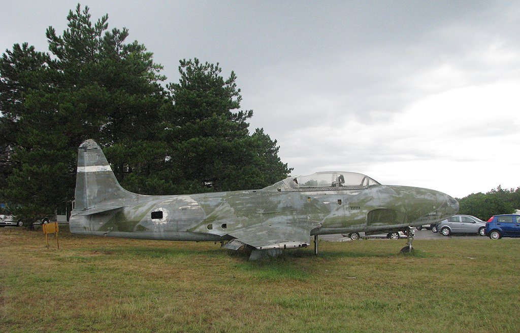 A parkoló bejáratánál egy füves terület közepén egy F-84G "Thunderjet" típusú vadászbombázó (Lovac Bombarder) fogadja a látogatót. A típusnak volt több modifikációja, a G modell az ötvenes évek elején állt rendszerben az USA légierejében. Festése megkopott, törzsén halványan felfedezhető az egykori Jugoszlávia ötágú vörös csillagos felségjele, a törzsön szereplő 676-os lajstromszámra csak a függőleges vezérsíkon még olvasható 10676 gyári számból lehet következtetni. A gép amúgy „egyben van”, nem hiányoznak róla szerkezeti elemek, mindkét, a szárnyvégekre szerelt póttartálya megvan, a dekli is sértetlen. A pilótafülke épségéről ennél a gépnél nem lehetett meggyőződni.