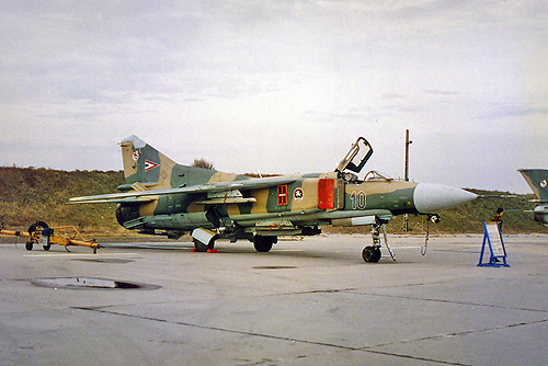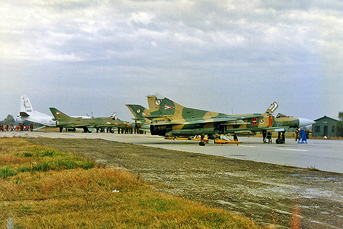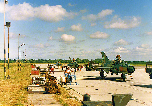 A repülőtérre beérkezve kiderült, hogy vendéglátónk még egy sofőrt is biztosított nekünk, így a parancsnoki UAZ-ban üldögélve apámmal és egy repülős barátommal csak néztem, ahogy sorra tünnek fel az eddig még nem látott repülőtér részletei. A 08-as Szu-22-UM3K messziről is feltünő egyedi festésével hamar magára vonta a figyelmet. Nem mertem fotózni. Ahogy haladtunk a zónához, már mindenfelé MiG-21-esek és 23-asok bukkantak fel, de a zónában valami egészen más várt ránk! Igen, az aznap délelőtti váltásban a még akkor önálló taszári alakulat gépei sorakoztak fel! Frissen nagyjavított Szu-22-esek és a MiG-21-esek, köztük a jól ismert Cápeti, kissé megkopott festéssel.A százados aki velünk volt, kérte, hogy lehetőleg az objektumok felé ne fotózzunk, de a kigurulások és felszállások nem fognak gondot jelenteni. És én csak álltam és fotóztam, sőt még egy magnót is vittem, hogy a hangjukat is megörökítsem, így valósítva meg a videózás egy furcsa alternatíváját. A kifutópálya relatív messzesége bizony még a 400mm-nek is sok volt, de jobbat egyszerüen nem lehetett tenni.