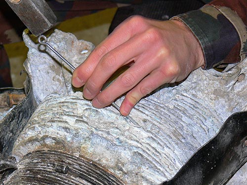 Roppant aprólékos és hosszadalmas munkát ad a hengerek alumínium hütőbordái közül a föld és az alumínium-oxid eltávolítása. Első fázis: fémtüske és kalapács segítségével fellazítani a megkeményedett szennyeződést
