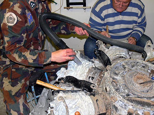 A szigetszentmiklósi motor munkálatai még nem tartanak itt, viszont a korábban Nemesvitánál amerikaiak által kiásott B-24H egy légcsavar-agya éppen elkészült.