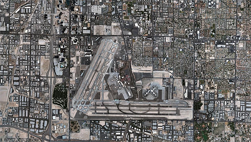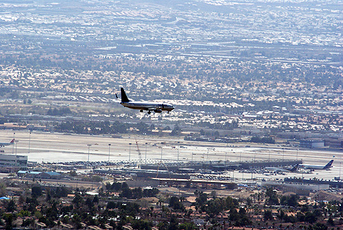 A Continental Airlines egyik Boeing 737-ese landol a McCarran nemzetközi repülőtéren. A felvétel a Stratosphere Tower 109-ik emeletéről készült 300 milliméter gyújtótávolságú teleobjektívvel. A város legmagasabb épületének számító kilátótorony nyitott kerengőjéről viszonylag távolról ugyan, de érdekes képeket készíthetünk a fel- és leszálló gépekről. A nagy távolság és a sivatag közelsége miatt a levegőben lévő finom por miatt természetesen nehéz fotótechnikailag tökéletes felvételeket alkotni, a különleges perspektíva azonban kárpótolhat cserébe