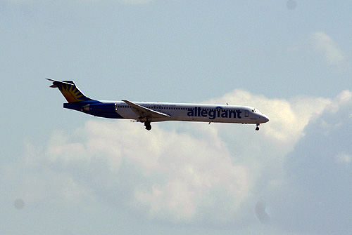 A vakációzók utaztatására szakosodott Allegiant Air egyik MD80-asa siklik a McCarran repülőtér leszállópályája felé