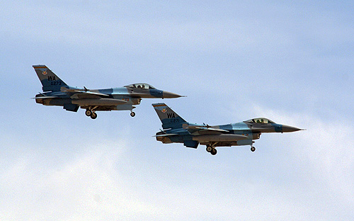 A sok szürke festésü harci gép fotózása után üdítő változatosságot jelentenek az agresszor századok érdekes színezésü F-15 Eagle és F-16 Fighting Falcon repülőgépei