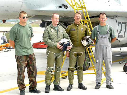 szervezkedésbe kezdtek. Ajándékból természetesen jutott bőven – többek között egy „betyárruha” – hiszen Axo-t mindenki kedvelte, kedveli a századnál. A második életre szóló ajándék „átadására” a mai napon került sor,‑ Koczka Attila őrnagy kézbesítésével ‑ amikor is egy MiG-29UB hátsó ülésében megtapasztalhatta milyen érzés meglovagolni egy orosz (ex-szovjet) vadászrepülőgépet. A leszállást követően boldogan osztotta meg jelen lévő svéd kollégáival élményeit, majd váratlanul egy újabb „meglepetés” zúdult a nyakába. Mint ahogyan az ilyen esetben „pilótáéknál”szokás, tüzoltó autóból locsolták le a búcsúrepülését végrehajtó Ulf Axelsson “Axo” őrnagyot.