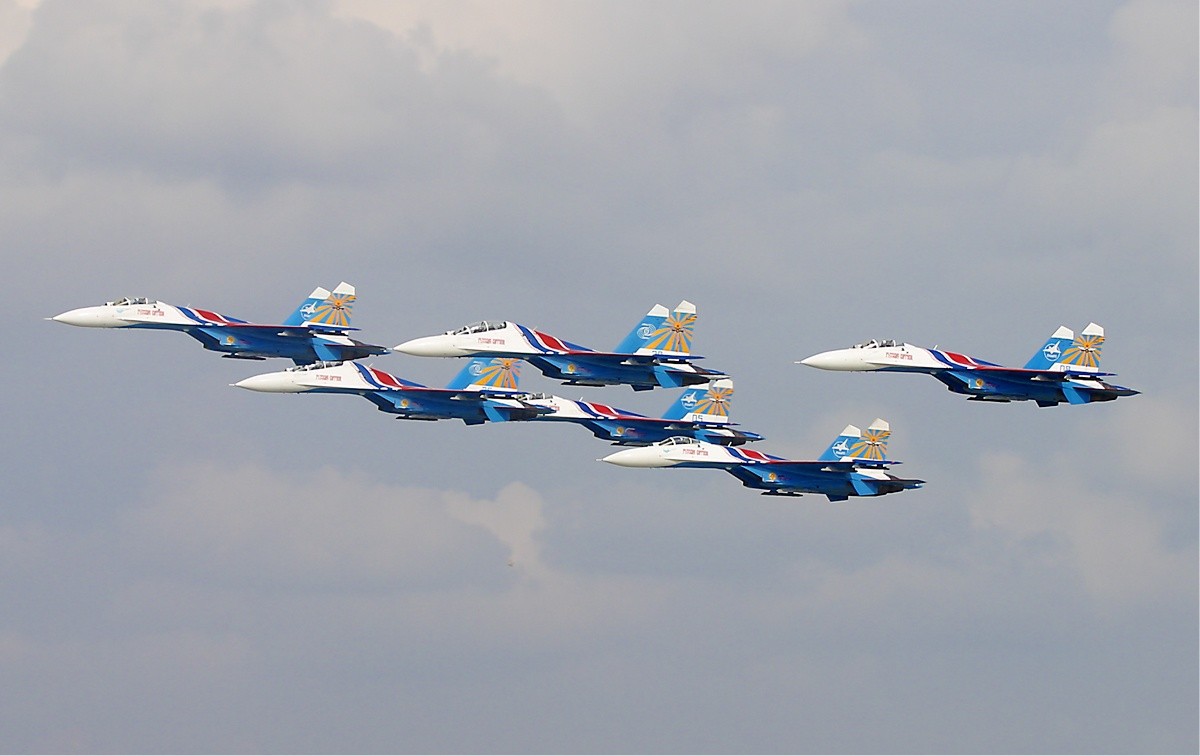 Természetesen az orosz kötelékek – az „Orosz Sasok”, a „Fecskék” és a sokat szenvedett „Orosz Lovagok” – is repültek a kiállítás ideje alatt.