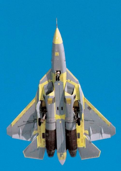 A lassan haladó oroszországi demokratizálódási folyamat eredménye, hogy a repülést kedvelő internetes közösség már nyíltan tárgyalhat a még titkosnak számító programról. Noha a "spotter"-tevékenység a tiltott kategóriából a türtbe került, még nem lehet elvárni, hogy Szibériában a -15-20 fokban is ott álljanak a kerítésnél az igazán elvetemültek, hogy lencsevégre kapják az újdonságokat. Mivel a komszomolszki bázis lakott területek közvetlen közelében található, áramlottak az információk, mikor hajtómüvezték a gépet, mikor milyen lesz a szélirány, stb. A gyári fotósokon kívül azonban csak néhány kivételezett médium kapott lehetőséget a nagy jelentőségü esemény megörökítésére, amelyről sajnos csak néhány igazán jó minőségü fotó került nyilvánosságra az első napokban. Ezek alapján számos érdekesség látszik, amelyeket igyekszünk sorra venni, de előbb néhány szó az első repülésről.Szergej Bogdan jelölték a nem mindennapi feladatra, ez azt is jelenti, hogy ő már évek óta dolgozik a programban, és szimulátorban régóta "repüli" a típust. Az első repülésre utánégető alkalmazása nélkül került sor, a két 117Sz hajtómü együttesen kb. 17 tonnás tolóereje bőven elegendő, az esetek többségében a szériagépek is forszázs nélkül szállnak majd fel, a maximális teljesítmény (ez jelenleg egyenként 14,5 tonna) csak a manőverezéshez és az elfogásoknál szükséges gyors emelkedéshez kell majd. A tesztrepüléseket általában csak a feladathoz tervezett tüzelőanyag-mennyiséggel végzik, így valószínüsíthetően csak 30-40%-os feltöltöttséggel szállt fel a gép, amely a kint hagyott futómüvek és a részleges hajtómü-teljesítmény ellenére meredeken emelkedett. A kísérő kétüléses Flankerből készült videofelvételek szerint a futómüvet később megmüködtette a pilóta, és kb. 30 fokos bedöntésü fordulókat végzett, azaz a gép alaprendszereinek müködését tesztelte. A hajtómüvek vektoráló rendszere valószínüleg még nem müködik, azt a későbbi fázisokban aktiválják, amikor már elég tapasztalat gyülik össze a "fly-by-wire" rendszer müködésével kapcsolatban. A 47 perces repülés rendben lezajlott, Szergej Bogdan a leszállás után átesett az oroszoknál szokásos procedúrán, a tervezők és müszakiak a levegőbe dobálták.