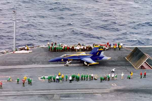 A század által használt repülőgépek kisebb átalakításoktól eltekintve mindig is megegyeztek a harcoló alegységek által használt repülőgépekkel, tehát alkalmasak a repülőgép hordozó fedélzeti üzemre is. Első alkalommal mégis csak 1998. novemberében landolt a Blue Angels kék-arany repülőgépe egy repülőgép hordozó fedélzetén. A hajó a CVN-75 USS Harry S. Truman volt, a gép pilótája pedig a század akkori parancsnoka Patrick Driscoll parancsnok.