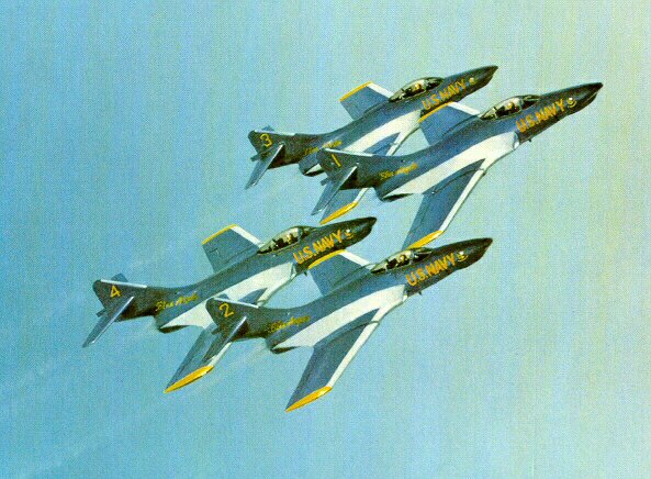 A 68-as év több változást is hozott. Először típusváltás történt a Blue Angels szállító részlegénél. Az öreg C-54 Skymastert egy C-121J Constellation váltotta fel. Ebben az évben került az első hölgy a csapathoz Mary Russel fregatthadnagy személyében, aki az adminisztratív tiszt pozícióját töltötte be 1970-ig. Ez év november 17-én a Grumman F-11F-1 Tigertől is búcsút vett a kötelék, amellyel 12 évadon keresztül kápráztatták el a közönséget. A váltótípus, a McDonnell Douglas F-4J Phantom II első példányát december 23-án a kötelék parancsnoka, Bill Wheat sorhajóhadnagy repülte át Pensacolába. Mindezidáig a Phantom volt a csapat egyetlen olyan típusa, amellyel a konkurens bemutató kötelék, a légierő Thunderbirds csapata is repült. Az első bemutatóra az új típussal 1969. március 15-én került sor az arizonai Yumában. Egy különleges eset is füződik az F-4-eshez. Még ebben az évben augusztus 6-án egy kanadai gyakorló bemutatón történt, a négygépes gyémánt kötelék rózsát hajtott végre, amikor a 2-es géppel repülő Vince Donile százados átlépte a hangsebességet és a környék összes ablaka kitört, a helyi üvegesek nagy örömére. Az eset azért érdekes, mert a hangsebességet csak kijelölt légtérben, nagy magasságban szabad átlépni.