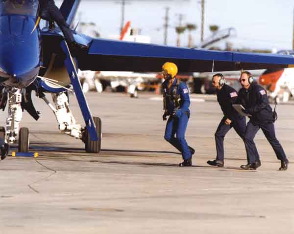 A 11 pilótából 1-től 6-ig a kötelék tagjai. Az 1-es számú gép pilótája a kötelék mindenkori vezetője és egyben a század parancsnoka is. Személyét a Haditengerészet Repülő Kiképzési Főnöke választja ki. A jelöltnek legalább 3.000 óra repült idővel kell rendelkeznie harci típuson, és rendelkeznie kell harcászati repülőszázad parancsnoki gyakorlattal. A kötelék többi pilótájának minimum 1.350 óra harci típuson szerzett repült idővel és repülőgép hordozós minősítéssel kell rendelkeznie. A kötelék egy pilóta beosztását mindig tengerészgyalogossal töltik be, hogy folyamatos legyen a Tengerészgyalogság képviselete a Blue Angels csapatában. A 7-es számú pilóta a narrátor, akinek ugyanazoknak a követelményeknek kell megfelelnie, mint a kötelék többi tagjának. Ő egy év narrátori szolgálat után bekerül a kötelék „aktív” tagjai közé. A 8-as az esemény koordinátor, aki szintén hajózó beosztású, de nem pilóta, hanem a Haditengerészet, vagy a Tengerészgyalogság fegyverzet operátora. Neki is legalább 1.350 repült órával kell rendelkeznie. A század C-130-asát, a „Kövér Albertet” tengerészgyalogosok üzemeltetik. A gépet repülő három fő pilóta kiválasztásánál követelmény a legalább 1.200 repült óra, valamint gépparancsnoki minősítés. A Blue Angels nem rendelkezik tartalék pilótával, mert annak nem lenne lehetősége mind a hat pozícióban begyakorolni a programot és összeszokni a kötelék többi tagjával. Ha a kötelék valamelyik tagja betegség, vagy sérülés miatt nem repülhet, nélküle mutatják be a programot. A parancsnok betegsége esetén a bemutatót törlik. A felkészülés során minden hajózónak legalább 120 gyakorló repülést kell végrehajtania, hogy a kötelék biztonságosan hajthassa végre bemutatóit.