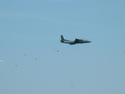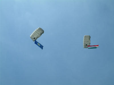 A program kiképzési repüléssel folytatódott. A várakozó légtérből két Mi-8 típusú helikopter érkezett, fedélzetén a bemutató ugrásra készülődő ejtőernyősökkel. A Magyar Légierő kecskeméti, szentkirályszabadjai és szolnoki ejtőernyősei 1200 méter magasságból kupola követést mutattak be MC-4 típusú ernyővel, majd öten, Méhész Sándor őrnagy, Molnár Tamás százados, Zsarnai Zsolt zászlós, Antalicz Jenő zászlós, Szöllösi János zászlós,2000 méterről Drakar ernyőkkel csillag alakzatban, füstölökkel közelítettek a föld felé. Az utolsó két ugró, Becs László törzsőrmester és Regenye András zászlós, a magyar nemzeti és a Magyar Légierő lobogójával érkezett a célterületre.