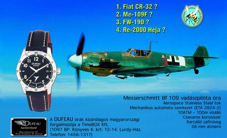 A Dufeau Watch Co. a Messerschmitt Bf 109 tiszteletére egy saját vadászpilóta órát fejlesztett ki, amelyek már magyarországon is megvásárólhatóak! Az órák kizárólagos hazai forgalmazója a TimeBox Kft. (1097 BP. Könyves Kálmán krt. 12-14. LurdyHáz. Tel.: 1456-1317)