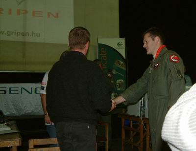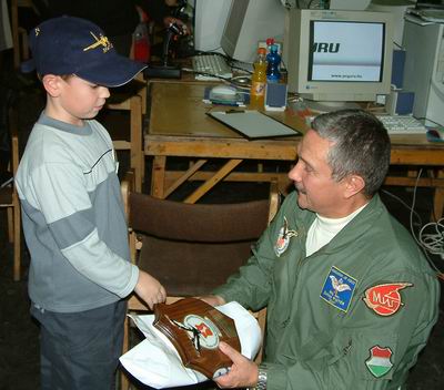 A legfiatalabb versenyzőnek járó plakettet és ajándékcsomagot, Pintér Zoltán dandártábornok az MH59 Szentgyörgyi Dezső Repülőbázis parancsnoka, MiG-29-es vadászpilóta adja át Hudák Bencének 7 éves versenyzőnek.